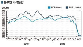 톨루엔 시세는 3월20일 FOB Korea 톤당 333달러로 126달러, FOB SE Asia 388달러, CFR Taiwan 357달러로 120달러 이상 대폭락했고 4월10일에는 FOB Korea가 276달러에 그쳤다.