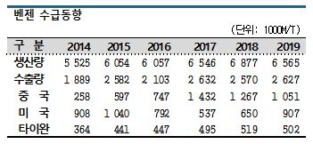 국내 벤젠 시장은 수출비중이 높아 호황일 때는 수익성이 높지만 불황일 때는 만성적인 공급과잉의 늪에서 헤어나지 못하는 구조로 판단되고 있다.