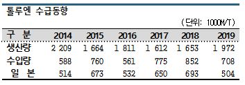 톨루엔은 생산량 자체가 줄어들고 있는 가운데 일본산 수입의존도가 높게 나타나고 있다.