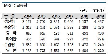 M-X는 생산량이 크게 증가하는 가운데 일본산을 대량 수입하고 중국과 타이완에는 수출하는 이중적인 수출입 구조를 나타내고 있다.