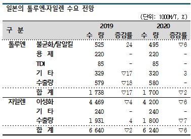 일본 방향족공업협회에 따르면, 일본은 BTX 수요가 2017년 1341만6000톤을 기록한 후 2018년 6% 줄어들었음에도 1300만톤대를 유지했으나 2019년에는 또다시 6% 감소하며 1223만3000톤에 머물렀다.