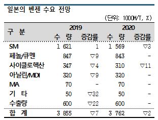 SM은 수요비중이 2014년 59.3%, 2015년 59.7%로 60%에 육박했으나 약간씩 떨어져 2018년에는 52.4%로 낮아졌으나 여전히 50%를 상회하고 있고, 페놀은 2014년 22.9%에서 2015년 24.9%로 높아진 후 2016년 24.1%로 떨어졌으나 2018년 27.0%로 다시 높아지고 있다. LG화학과 금호P&B화학이 증설경쟁을 벌이고 있기 때문으로 판단된다.