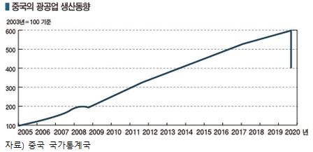 코로나19 발생국인 중국은 정부가 이동 및 공장 가동을 규제함에 따라 2020년 1분기 경제성장률이 마이너스 6.8%로 2019년 4분기에 비해 12%포인트 이상 하락해 사상 최저수준을 기록했고 광공업 생산은 최근 6개월 감소율을 산출해 연평균으로 환산한 결과 36% 줄어들 것으로 예상되고 있다.
