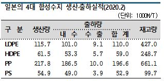 일본은 2020년 2월 에틸렌 크래커 가동률이 94.9%로 75개월 연속 90%를 돌파했으나 PE, PP 등 4개 합성수지는 출하량이 감소해 재고가 증가하고 있는 것으로 알려졌다.