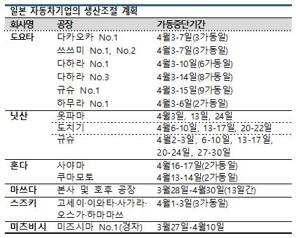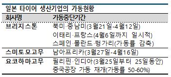 일본 타이어 생산기업 가운데 처음으로 가동중단 계획을 발표한 도요타이어도(Toyo Tire) 세계적인 수요 침체에 대응해 재고를 확대하고 있고 수출비중이 높은 센다이(Sendai) 공장은 4월3-9일 7일간 가동을 중단한 것으로 파악되고 있다.