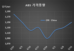 ABS 시세는 5월13일 CFR China 톤당 1150달러로 20달러 상승했고 CFR SE Asia 역시 1150달러로 20달러 올랐다.
