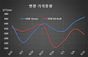벤젠 시세는 5월 둘째주 평균 FOB Korea 톤당 367달러로 22달러 상승했고 FOB SE Asia도 341달러로 17달러 올랐다. CFR China 역시 375달러로 11달러 상승했다.