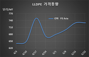 LLDPE 시세는 5월20일 CFR FE Asia 톤당 730달러로 변동이 없었고 CFR SE Asia는 730달러로 10달러, CFR S Asia는 720달러로 10달러 상승했다.