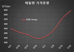에틸렌 시세는 5월20일 FOB Korea 톤당 645달러로 85달러 폭등했고 CFR SE Asia는 615달러로 110달러 대폭등했다. CFR NE Asia 역시 675달러로 95달러 폭등했다.