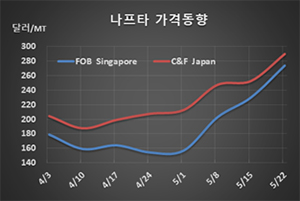 나프타 시세는 5월22일 C&F Japan 톤당 290달러로 37달러 폭등했고 FOB Singapore 역시 274달러로 44달러 폭등했다. CIF NWE는 266달러, FOB USG는 274달러로 올라섰다.