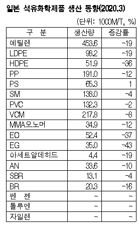 일본 석유화학공업협회에 따르면, 일본은 코로나19(신종 코로나바이러스 감염증) 사태 속에서 개인 소비가 크게 줄고 전방산업 가동중단 등이 잇따르면서 3월 LDPE(Low-Density Polyethylene), HDPE(High-Density PE), PP(Polypropylene) 등 4대 주요 수지 가운데 3개 품목의 출하량이 크게 감소했다.