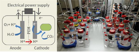 이에 새로운 방법으로 이산화탄소를 직접 탄소원(먹이)으로 활용해 성장할 수 있는 미생물에 환원력을 제공해주는 미생물 전기합성 바이오 융합기술이 제시되고 있다.