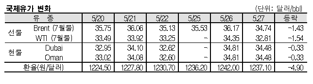 5월27일 국제유가는 미국-중국의 갈등 격화 영향으로 하락했다.
