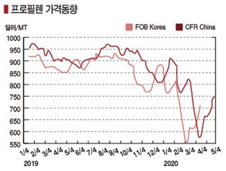 프로필렌 현물가격은 4월 초 550달러대 초반에 머물렀으나 5월22일에는 750달러로 급등하며 200달러대 후반으로 올라선 나프타와의 스프레드가 톤당 500달러로 벌어졌다.