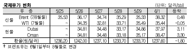 6월1일 국제유가는 OPEC(석유수출국기구)+ 감산규모 유지 전망 영향으로 상승했다. 6월1일 국제유가는 OPEC+의 감산규모 유지 합의 근접 소식 영향으로 상승했다. 표, 그래프: <국제유가 변화> <화학저널 2020/06/02> |