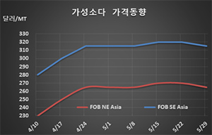 표, 그래프: <가성소다 가격동향> <화학저널 2020/06/05> |