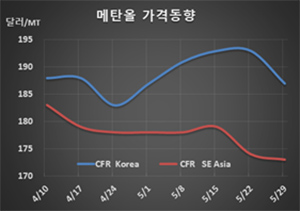 메탄올 시세는 5월29일 CFR Korea 톤당 187달러로 6달러 하락했고 CFR SE Asia 역시 173달러로 1달러 떨어졌다. CFR Taiwan은 176달러로 2달러 하락했고, CFR India는 보합세를 형성했으나 138달러에 불과했다.