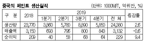 중국이 페인트산업이 수익성 개선에 성공했다. 표, 그래프: <중국의 페인트 생산실적> <화학저널 2020/06/09> |