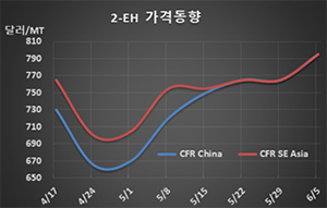 표, 그래프: <2-EH 가격동향> <화학저널 2020/06/09> |