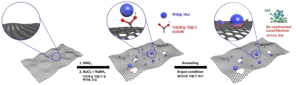 루테늄 금속과 다공성 탄소 지지체가 결합한 루테늄 탄소 복합 촉매는 이산화탄소가 포화한 전해질에서도 백금 촉매만큼 우수한 수소 발생 활성도를 보였고 1000시간 구동에도 높은 안정성을 유지했다.
