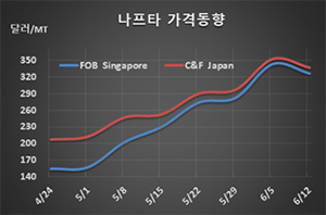 나프타(Naphtha)는 300달러대 초반으로 하락했다.