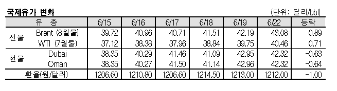 6월22일 국제유가는 글로벌 이동조치 완화 영향으로 상승했다. 6월22일 국제유가는 글로벌 이동조치 완화로 수요가 회복될 것이라는 기대가 확산됨에 따라 상승했다. 표, 그래프: <국제유가 변화> <화학저널 2020/06/23> |