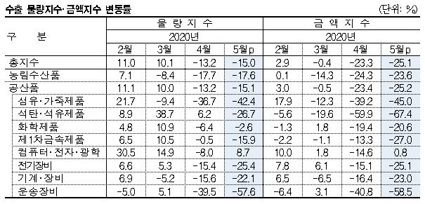 신종 코로나바이러스 감염증(코로나19) 여파로 5월 수출물량이 2009년 금융위기 이후 최대폭으로 감소했다.
