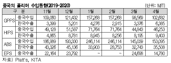 PS(Polystyrene)는 중국 수출이 소폭 증가했다. ABS(Acrylonitrile Butadiene Styrene)는 중국의 수입이 2019년 12월 19만3330톤에서 2020년 1월 24만6114톤으로 급증한 후 3월 14만5039톤으로 감소했으나 4월에는 15만3095톤으로 소폭 증가로 전환됐다. 표, 그래프: <중국의 폴리머 수입동향(2019-2020)> <화학저널 2020/07/01> |
