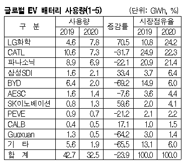 LG화학(대표 신학철)이 글로벌 전기자동차(EV) 1위 지위를 유지하고 있다. 표, 그래프: <글로벌 EV 배터리 사용량(1-5)> <화학저널 2020/07/02> |