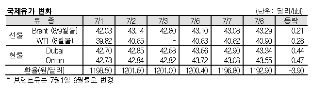 7월8일 국제유가는 미국의 휘발유 수요 회복 영향으로 상승했다. 7월8일 국제유가는 미국의 휘발유 수요가 회복 조짐을 나타낸 영향으로 상승했다. 표, 그래프: <국제유가 변화> <화학저널 2020/07/09> |