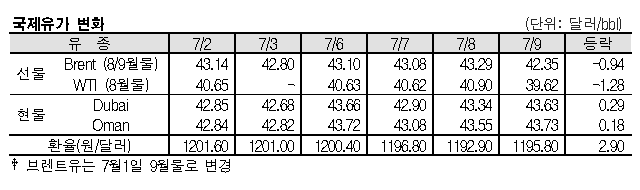 7월9일 국제유가는 코로나19(신종 코로나바이러스 감염증) 재확산 우려 영향으로 하락했다. 7월9일 국제유가는 코로나19에 따른 석유 수요 감소 우려 여파로 하락했다. 표, 그래프: <국제유가 변화> <화학저널 2020/07/10> |