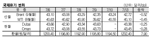 7월13일 국제유가는 코로나19(신종 코로나바이러스 감염증) 확산 영향으로 하락했다. 7월13일 국제유가는 코로나19 확산 영향으로 하락했다. 표, 그래프: <국제유가 변화> <화학저널 2020/07/14> |