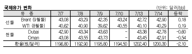 7월14일 국제유가는 OPEC(석유수출국기구)+의 감산 준수율 호조 영향으로 상승했다. 7월14일 국제유가는 OPEC+ 감산 영향으로 상승했다. 표, 그래프: <국제유가 변화> <화학저널 2020/07/15> |