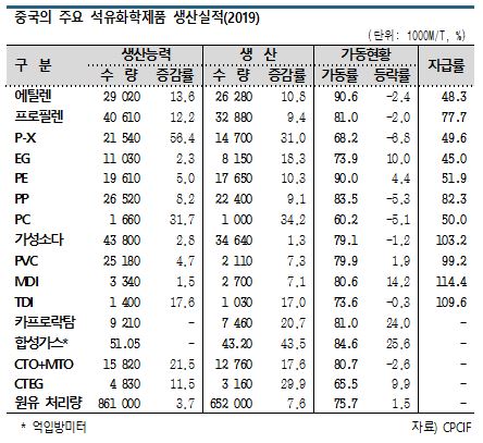 중국은 2019년 석유정제, 가성소다(Caustic Soda), 합성고무, MDI(Methylene di-para-Phenylene Isocyanate) 가동률이 상승했으나 P-X(Para-Xylene), PC(Polycarbonate) 등은 정체 양상을 나타냈다.