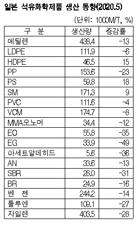 일본은 석유화학제품 공급을 계속 줄이고 있다. 표, 그래프: <일본 석유화학제품 생산 동향(2020.5)> <화학저널 2020/07/20> |