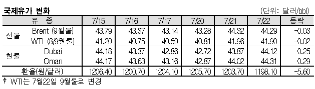 7월22일 국제유가는 미국의 원유 재고 증가 영향으로 하락했다. 7월22일 국제유가는 미국의 원유 재고가 증가한 영향으로 하락했다. 표, 그래프: <국제유가 변화> <화학저널 2020/07/23> |