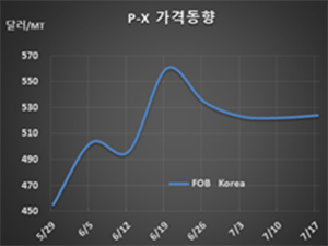 P-X는 국제유가가 브렌트유(Brent) 기준 배럴당 43.15달러로 0.09달러 하락했으나 43달러대를 유지했음에도 불구하고 현물가격이 7월17일 FOB Korea 톤당 524달러로 2달러 상승에 그쳤다. CFR SE Asia는 527달러, CFR China 역시 542달러로 2달러 오르는데 머물렀다.
