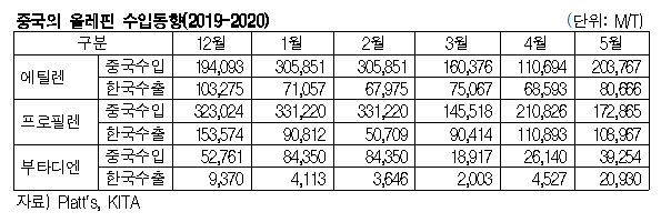 표, 그래프: <중국의 올레핀 수입동향(2019-2020)> <화학저널 2020/07/27> |