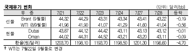 7월28일 국제유가는 미국의 추가 경기부양책 협의 난항 영향으로 하락했다. 7월28일 국제유가는 미국의 추가 경기부양책 관련 협의가 난항을 나타낸 영향으로 하락했다. 표, 그래프: <국제유가 변화> <화학저널 2020/07/29> |