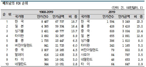 베트남에 대한 FDI는 인가건수 및 인가금액 모두 한국이 1위, 일본이 2위로 1988-2019년 전체에서 양국이 차지하는 비중이 약 40%에 달했으나 2019년에는 중국과 홍콩 투자가 급증하면서 순위가 변화했다.