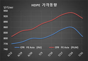 HDPE 시세는 7월29일 인젝션(Injection) 그레이드가 CFR FE Asia 톤당 810달러로 50달러 폭락했고 CFR SE Asia 역시 830달러로 50달러 폭락했다. 블로우몰딩(Blow-Molding)도 FEA는 860달러로 무려 80달러 폭락했고 SEA는 910달러로 50달러 폭락했다. 필름(Film)은 FEA가 910달러로 30달러, SEA는 930달러로 30달러 급락했고, 얀(Yarrn)은 FEA가 880달러로 30달러 급락했고 SEA는 880달러로 40달러 폭락했다.