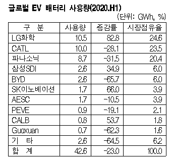 LG화학(대표 신학철)이 글로벌 전기자동차(EV) 배터리 1위 지위를 유지했다. 표, 그래프: <글로벌 EV 배터리 사용량(2020.H1)> <화학저널 2020/08/03> |