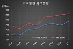 프로필렌 시세는 8월7일 FOB Korea 톤당 795달러로 15달러 상승했으나 CFR SE Asia는 775달러로 5달러 하락했다. 하지만, CFR China는 835달러로 15달러, CFR Taiwan은 840달러로 10달러 상승했다.