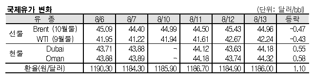 8월13일 국제유가는 글로벌 석유 수요 전망 하향조정 영향으로 하락했다. 8월13일 국제유가는 각 기관의 글로벌 석유 수요 전망 하향조정에 영향을 받아 하락했다. 표, 그래프: <국제유가 변화> <화학저널 2020/08/14> |