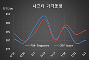 표, 그래프: <Naphtha 가격동향> <화학저널 2020/08/14> |