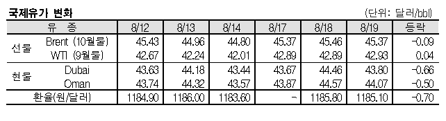 8월19일 브렌트유(Brent)는 글로벌 경기 둔화 우려가 심화된 영향으로 하락했다. 8월19일 브렌트유는 글로벌 경기 둔화가 계속될 것이라는 우려 아래 하락했다. 표, 그래프: <국제유가 변화> <화학저널 2020/08/20> |
