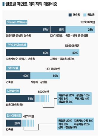 3대 메이저인 Sherwin-Williams(S&W), PPG인더스트리(PPG Industries), 악조노벨(AkzoNobel)은 사업을 대폭 확대해 시장 장악력을 굳건히 하고 있다.