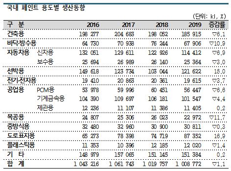 자동차용 페인트 생산량도 국내 자동차 시장 축소에 영향을 받은 것으로 추정되며 2020년에는 코로나19(신종 코로나바이러스 감염증) 사태로 자동차산업이 직격탄을 받아 감소폭이 확대될 것으로 예상되고 있다.