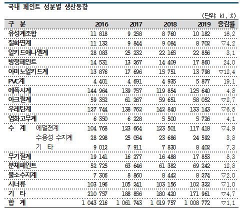 페인트 생산량은 2015-2017년 증가세를 나타냈으나 2018년 101만9757킬로리터로 줄어든 후 2년 연속 감소해 부진이 계속되고 있다.