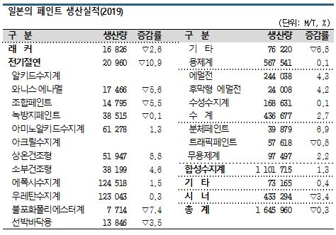 일본페인트공업협회에 따르면, 2019년 페인트 생산량은 164만5960톤으로 0.3% 감소했다. 전기절연 페인트와 시너 등이 감소했으나 주력제품인 합성수지 페인트가 소폭 증가하며 감소폭을 제한했다.